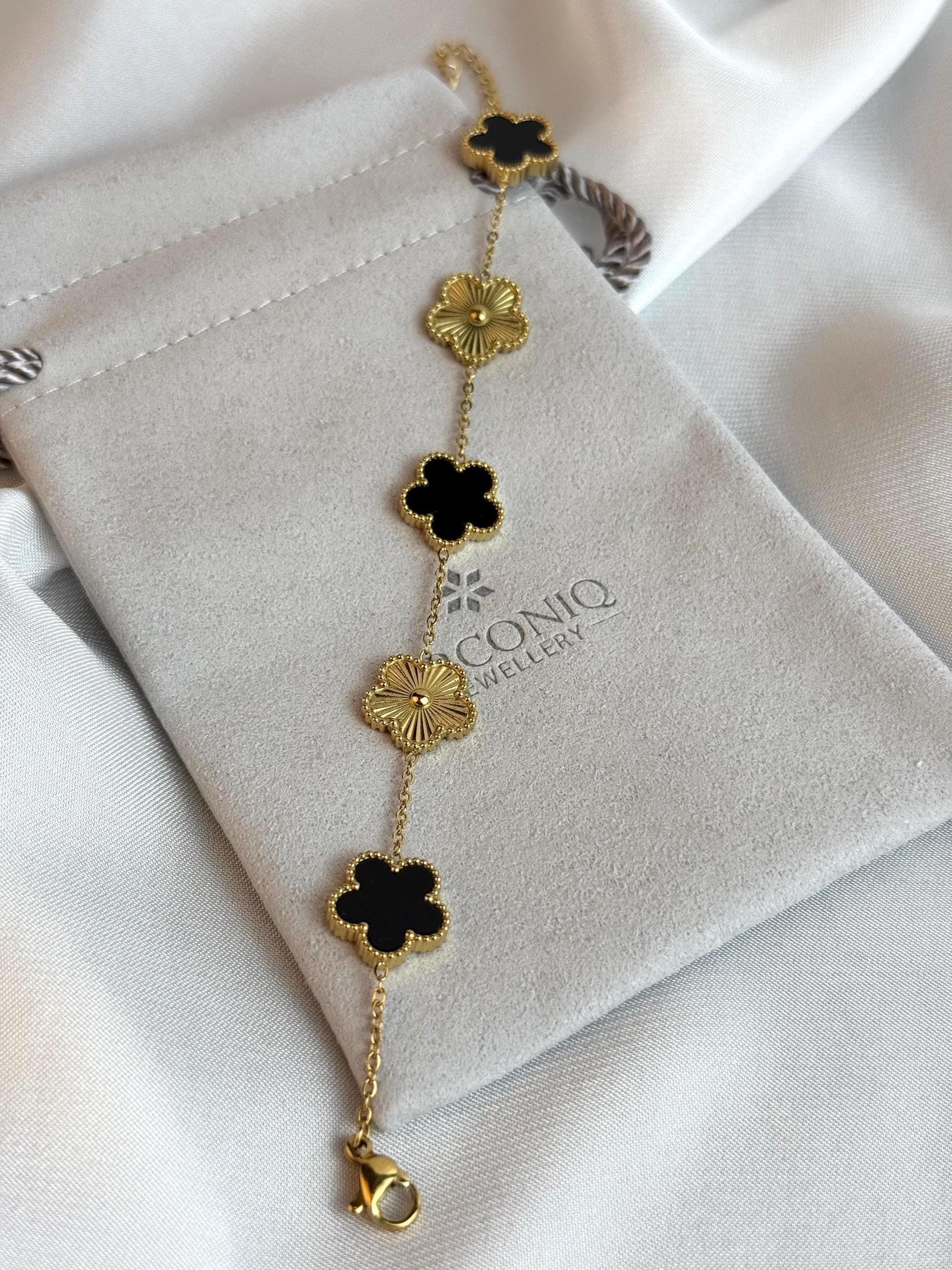 Black and Gold Lucky Bracelet - Double Sided Five Leaf Clover Bracelet - 18K Gold Plated Stainless Steel Bracelet - Jewelry for Her