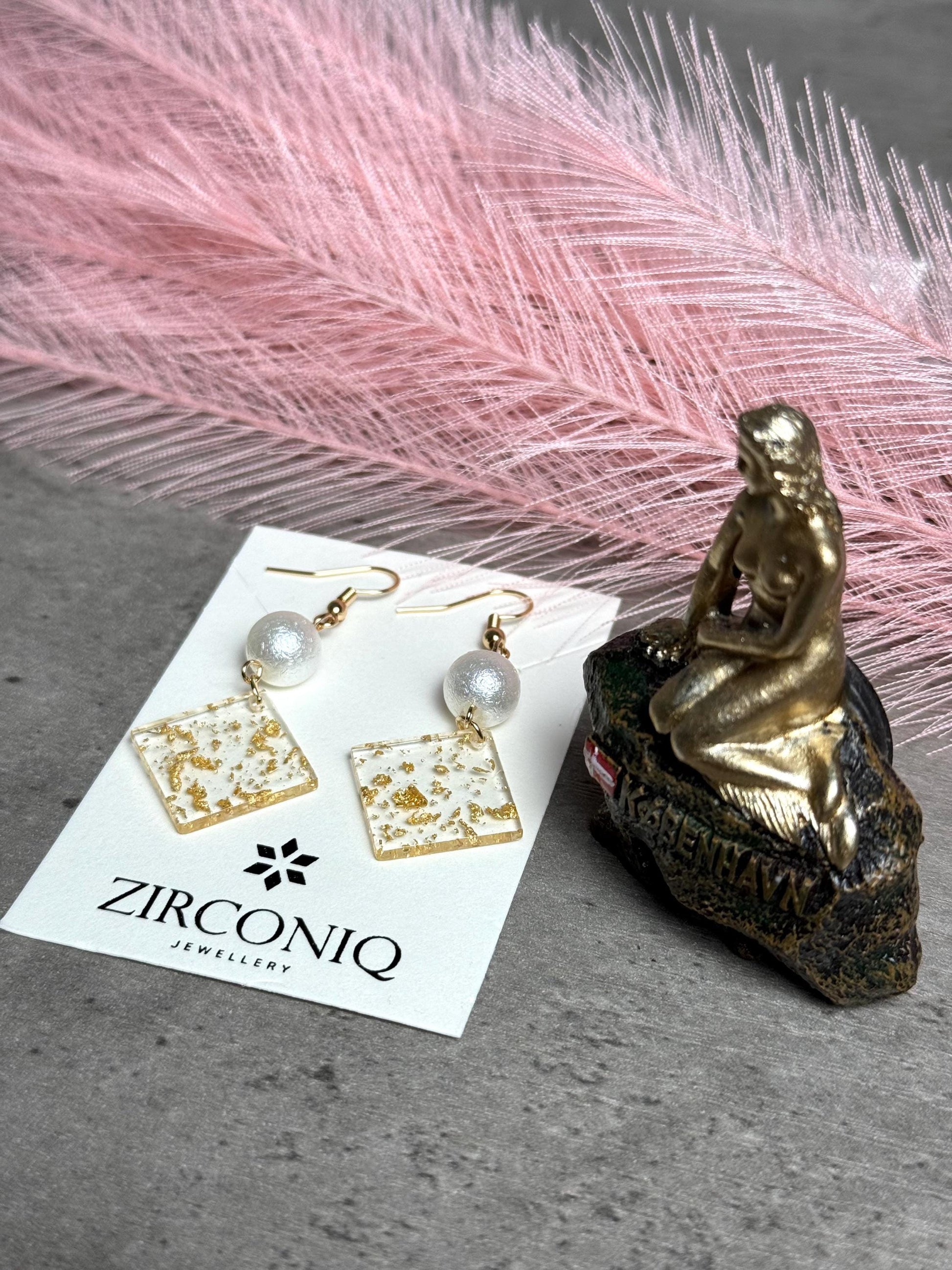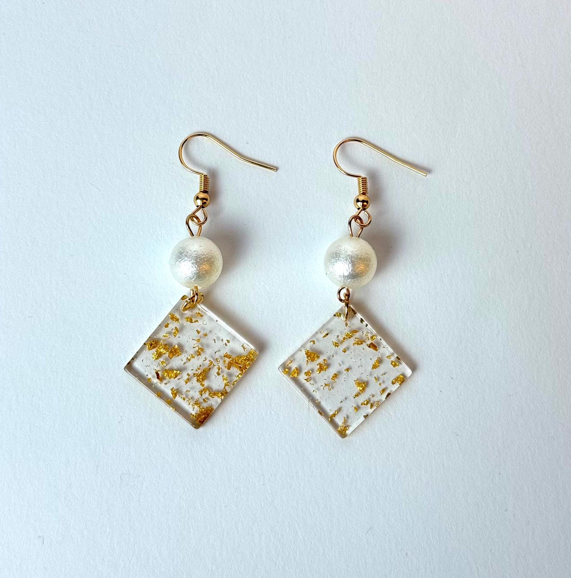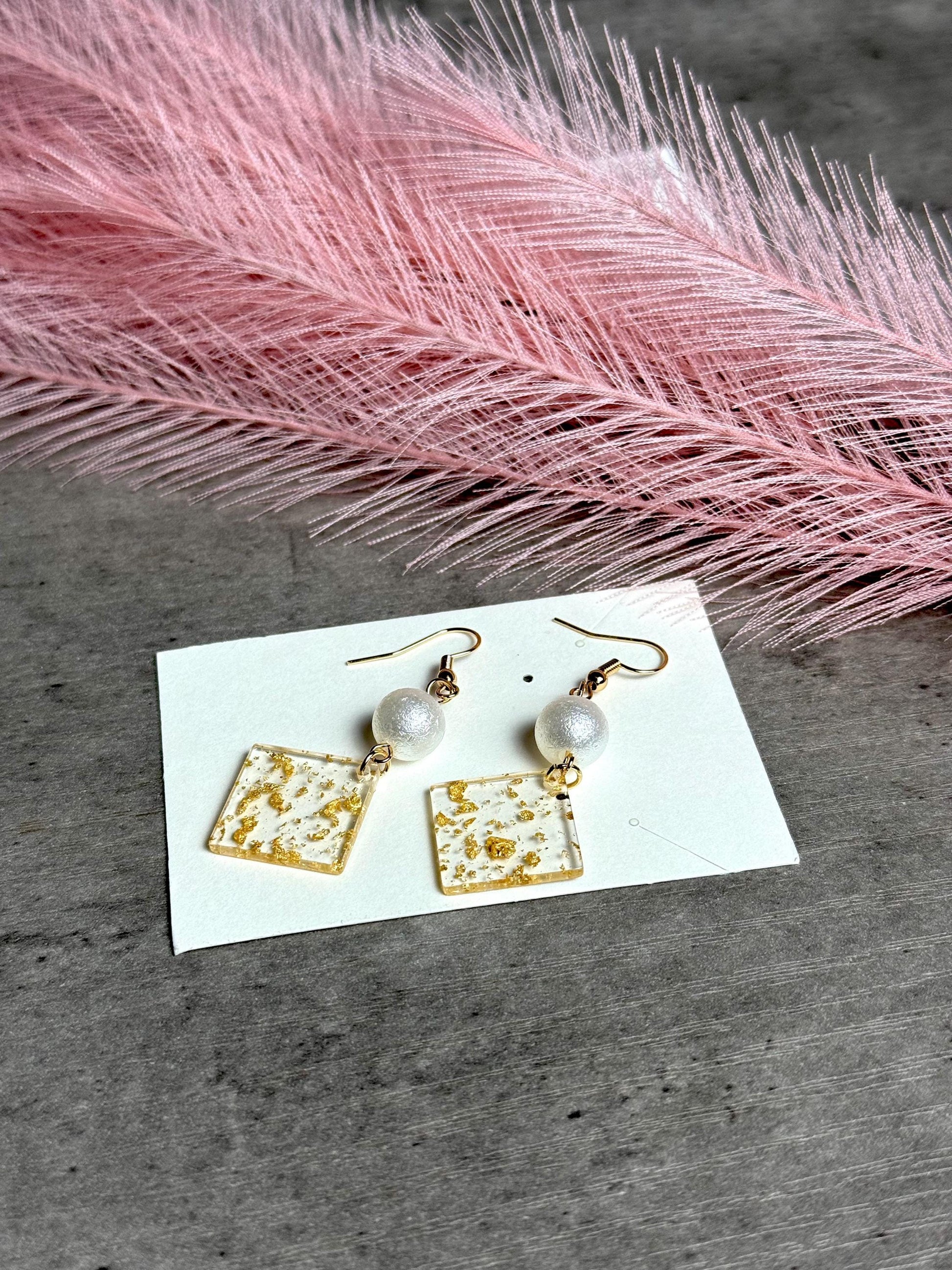 Add a touch of elegance to your outfit with these stunning handmade dangle earrings. Featuring a beautiful combination of a pearl bead and a square resin pendant filled with delicate gold leaf flakes, these earrings are lightweight and perfect for both everyday wear and special occasions. The gold-tone hooks complement the design, adding a luxurious finish to these unique statement pieces. Whether you're dressing up for a party or adding sparkle to your casual look, these earrings will make a perfect accessory.