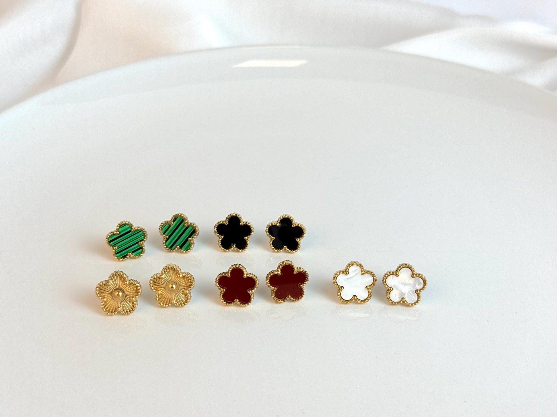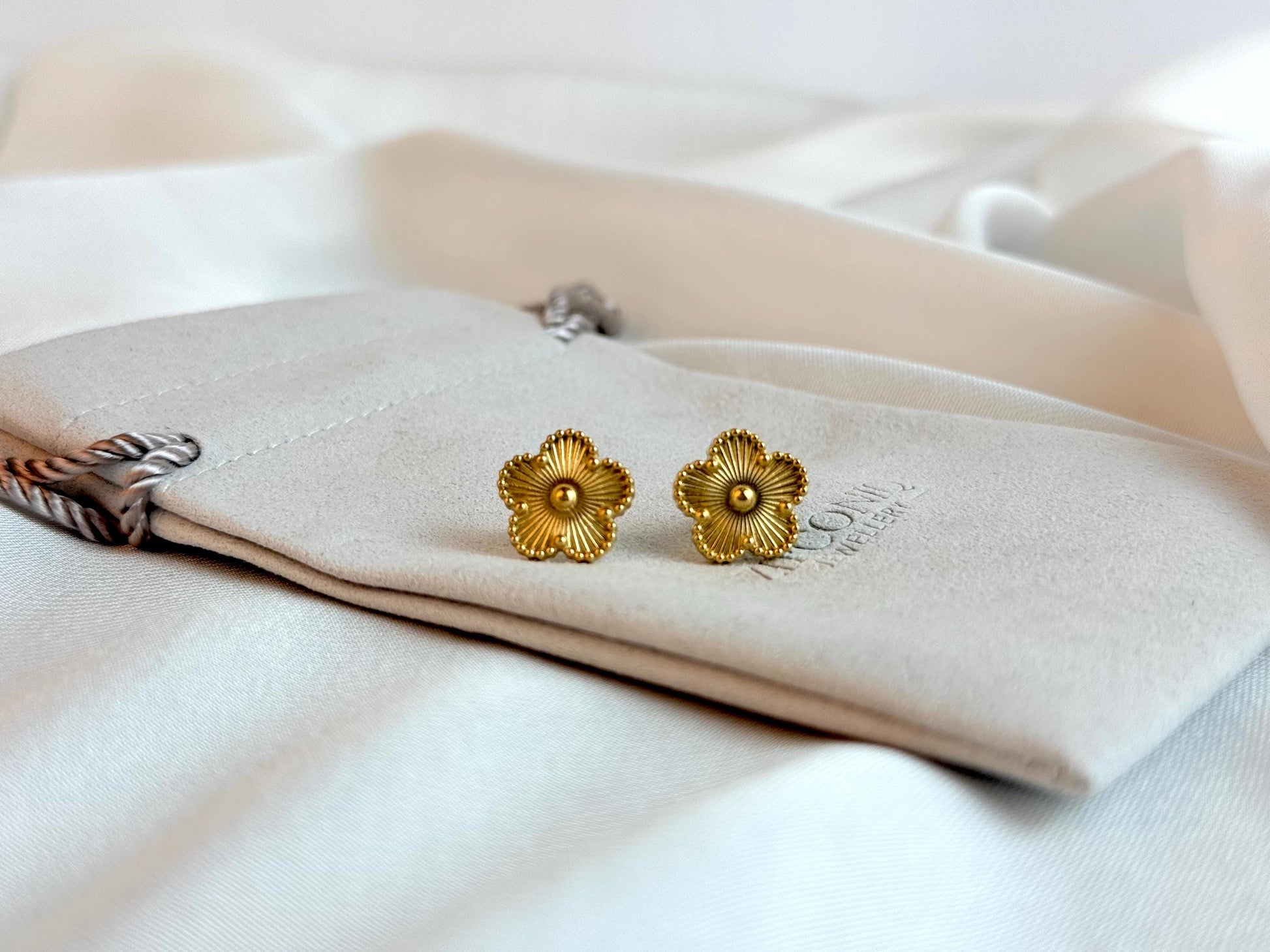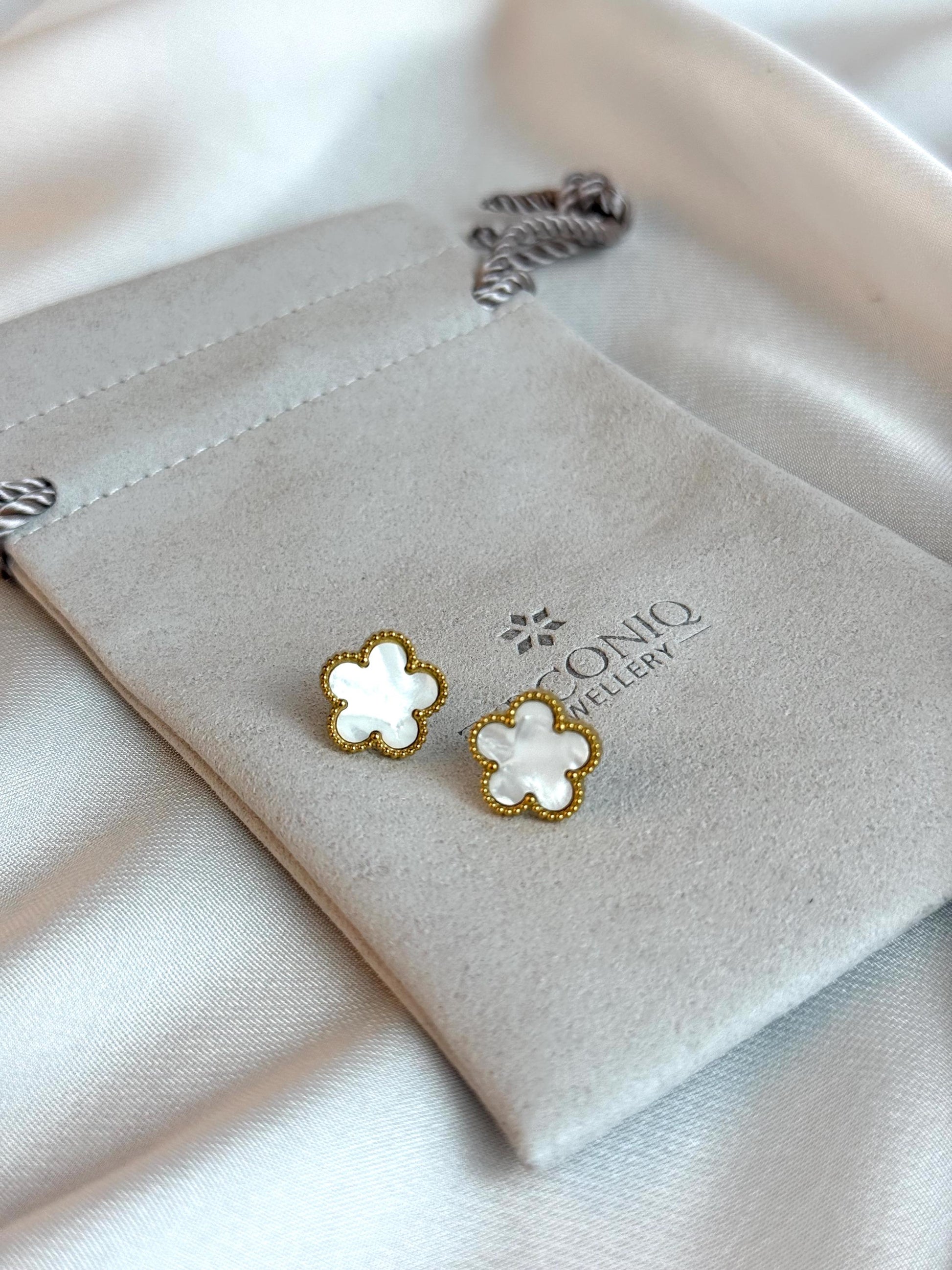 Design: Clover-shaped studs with a beaded gold border