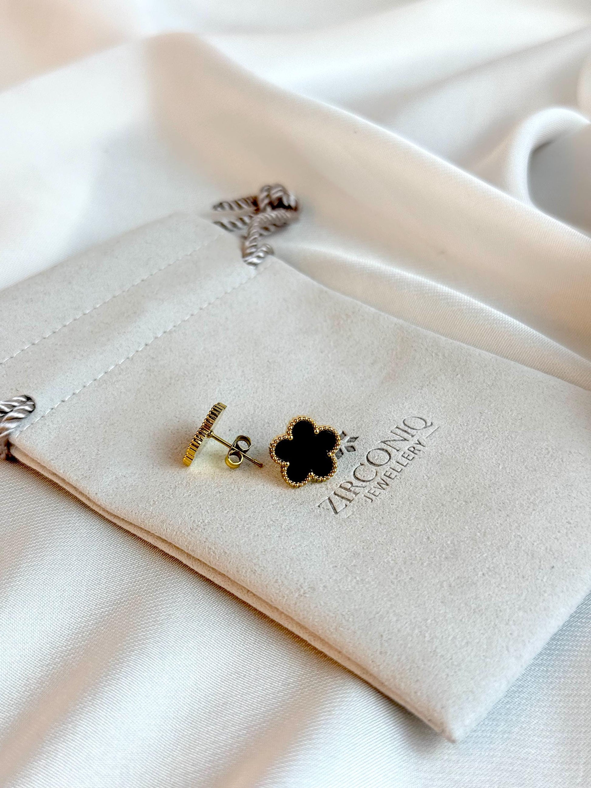 Add timeless elegance to your jewelry collection with these exquisite 18K gold-plated stud earrings featuring a beautiful clover-shaped design made by Zirconiq Jewellery. Available in classic black and white options, the earrings are crafted from high-quality stainless steel for durability and long-lasting shine. Perfect for both casual and formal wear, these earrings are lightweight and comfortable for everyday use.