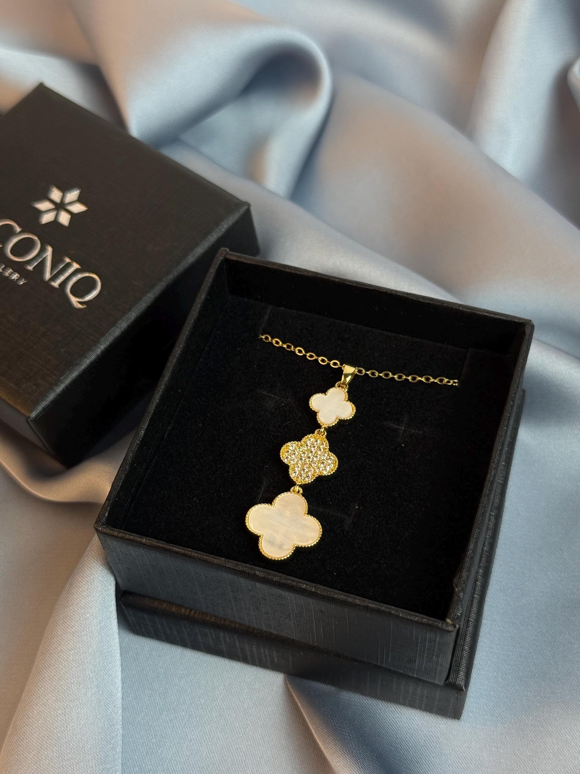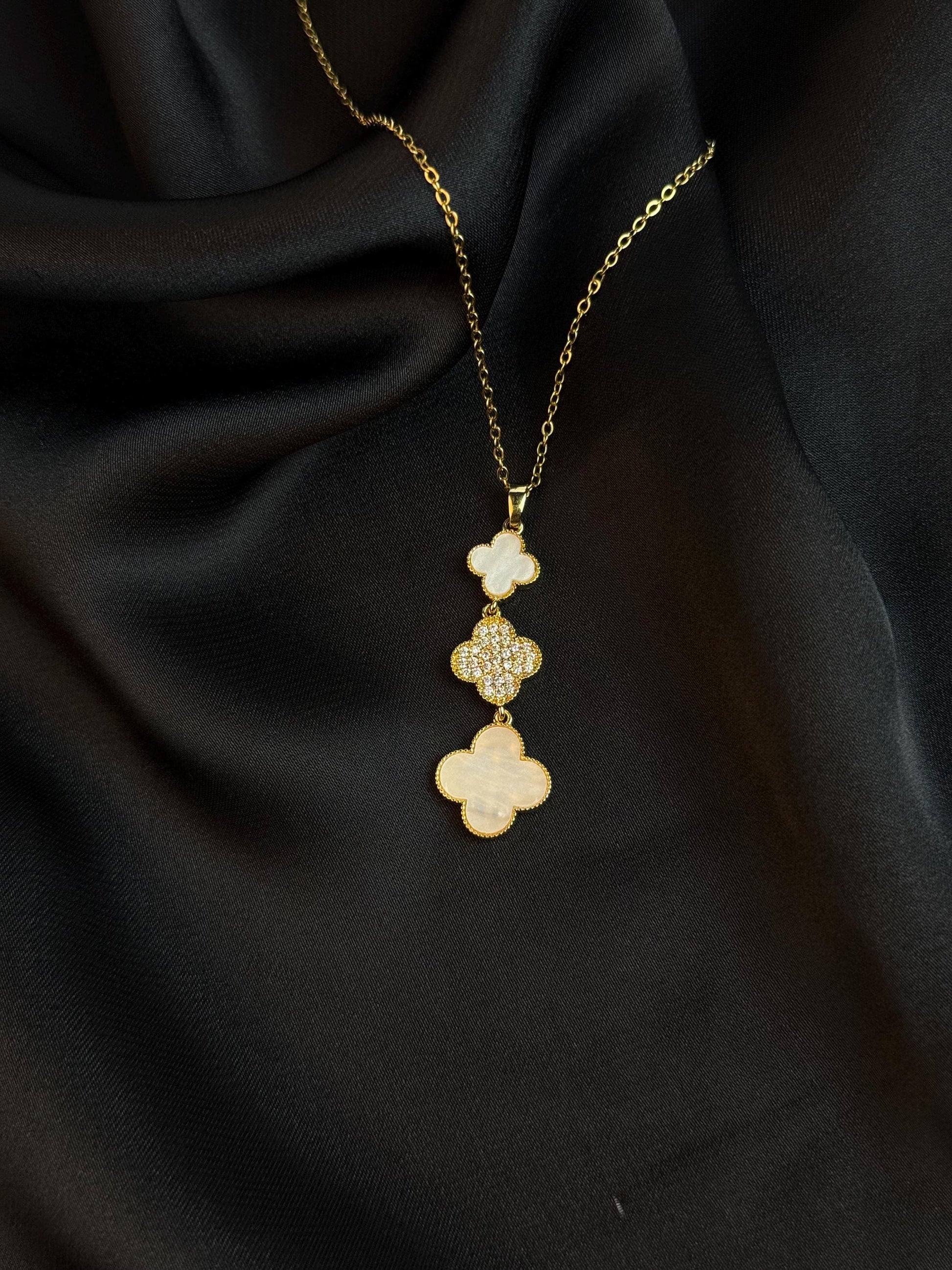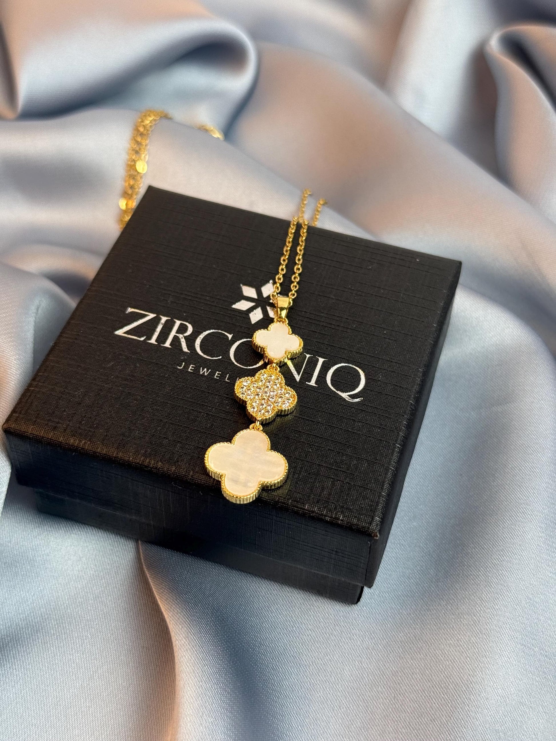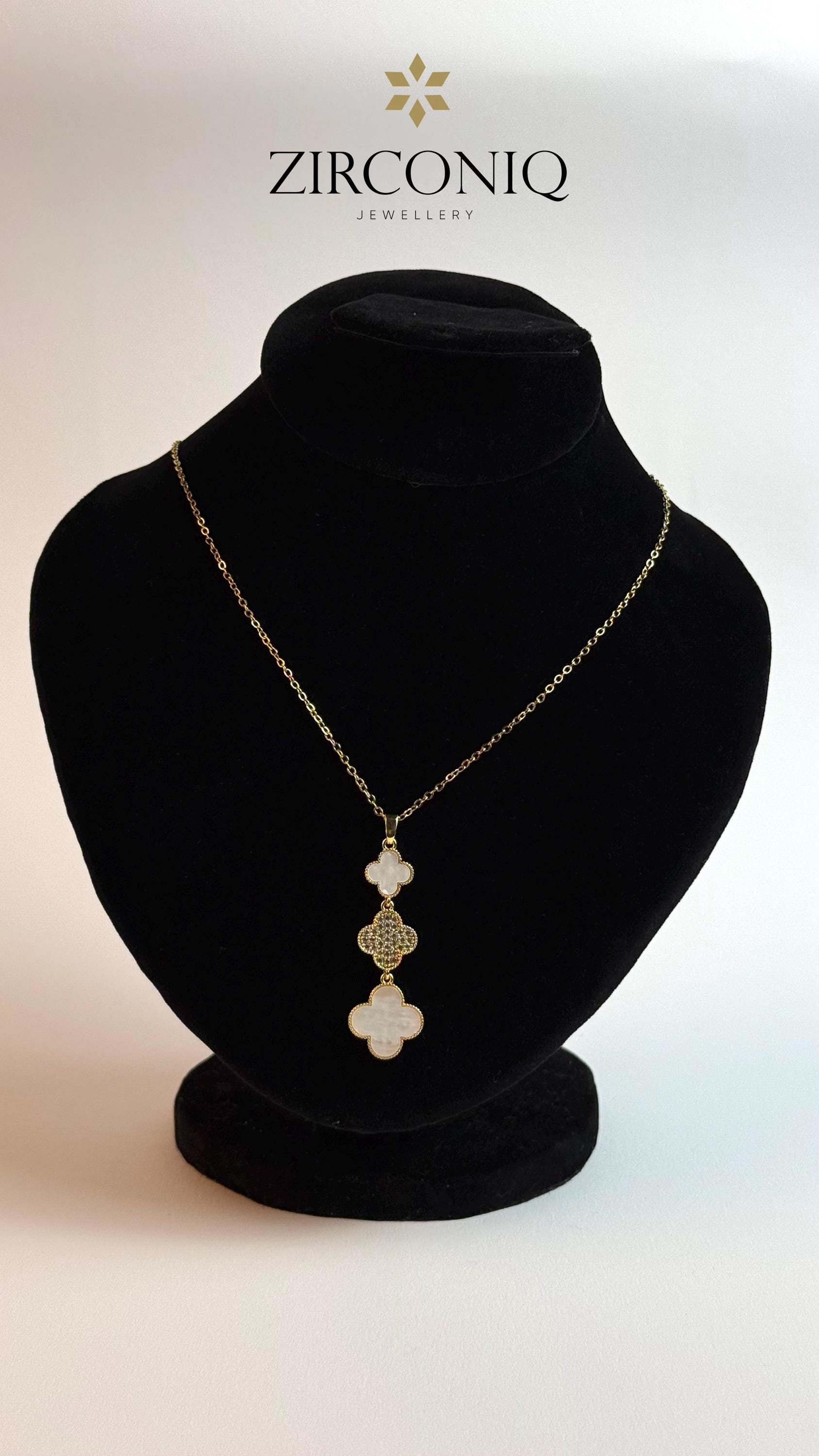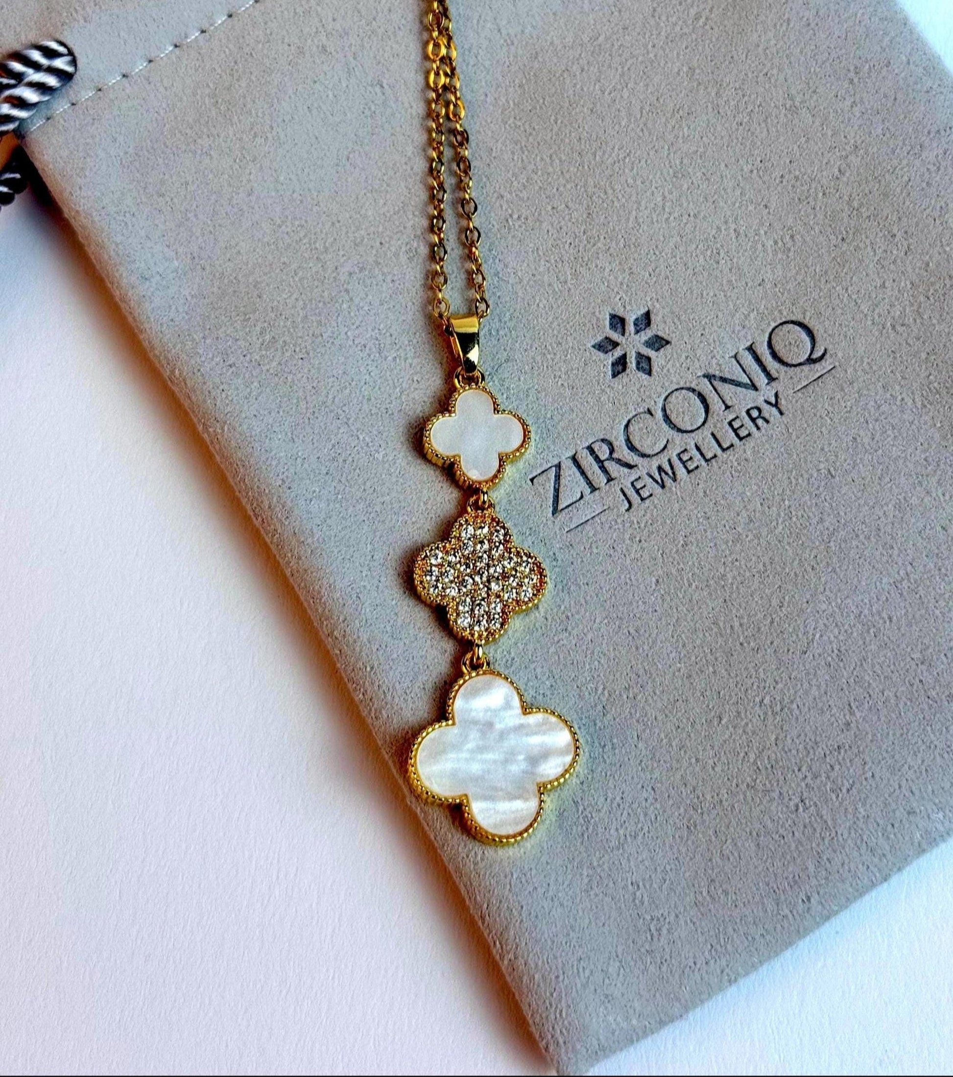 Design: 18k Gold Plated Stainless Steel triple clover-shaped pendant adorned with zircon stones