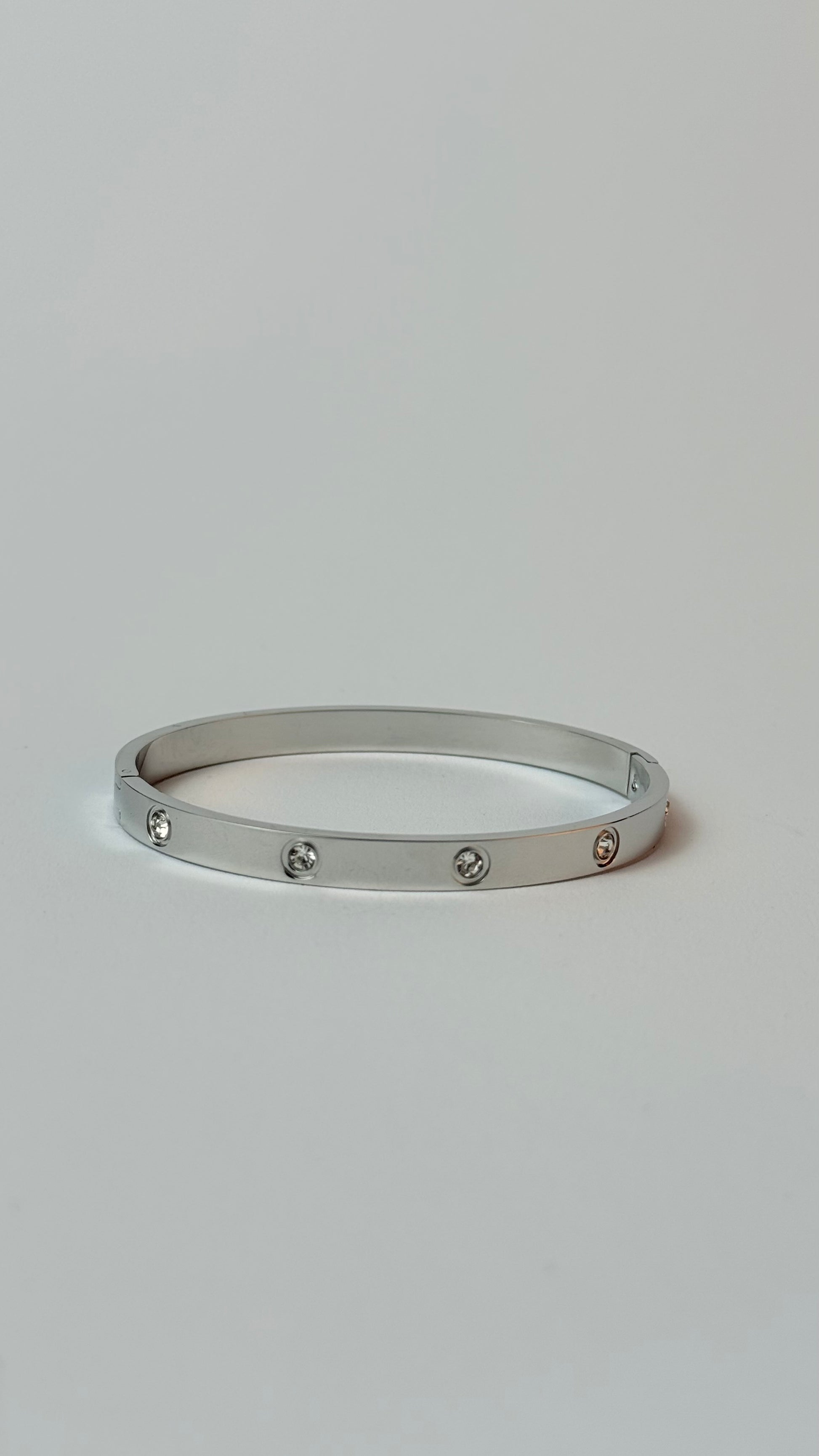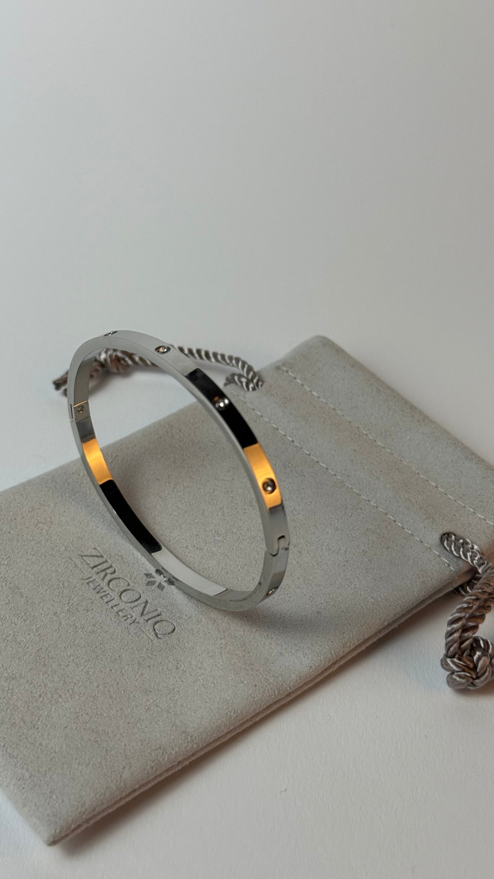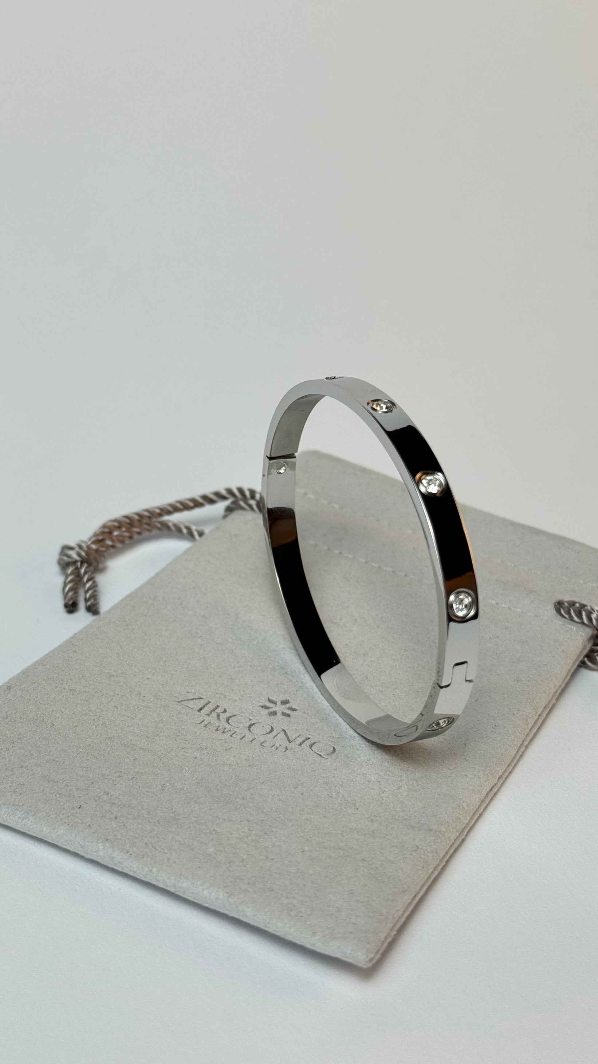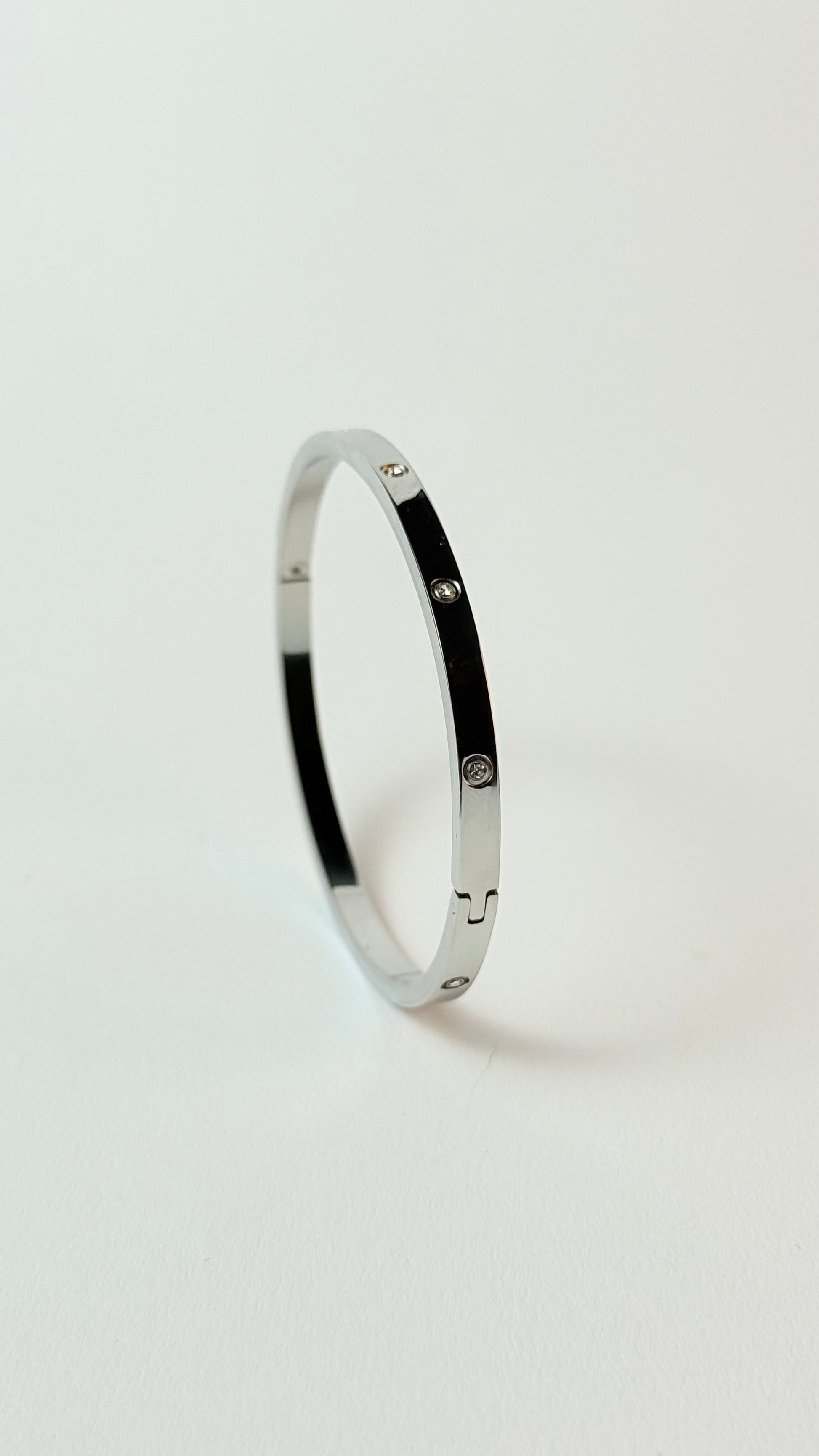 Zircon Studded Stainless Steel Silver Plated Bangle Bracelet - Silver