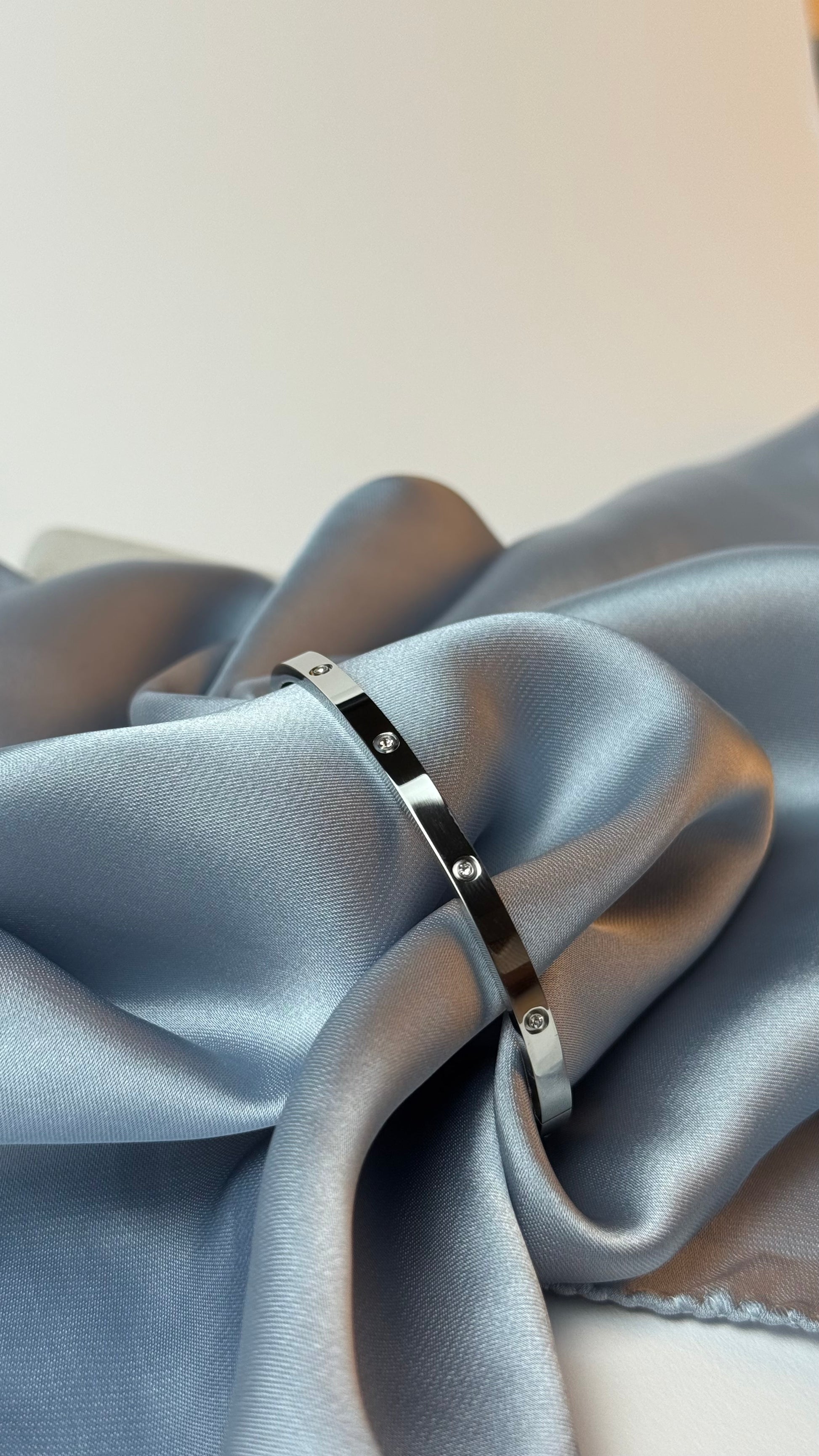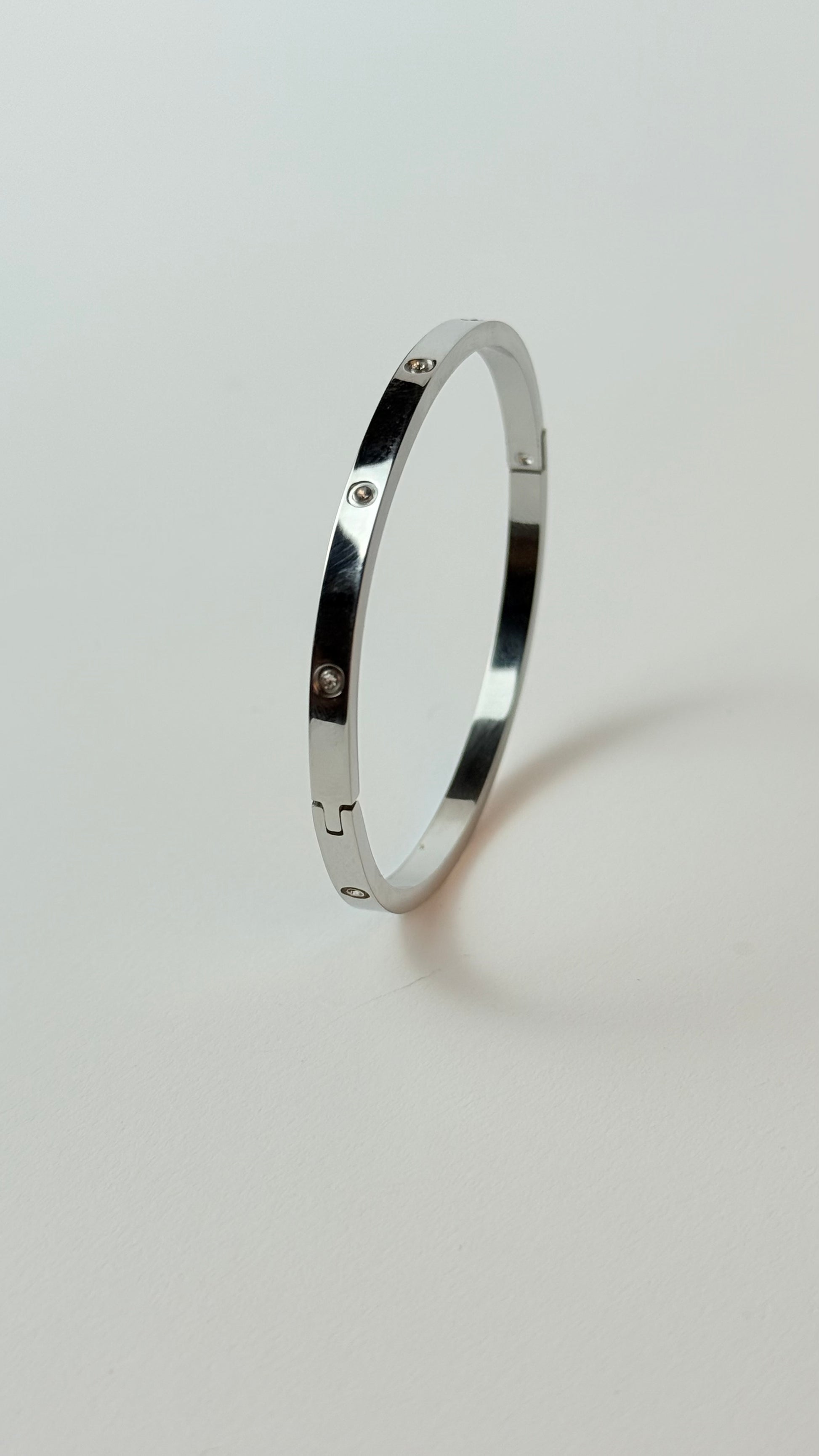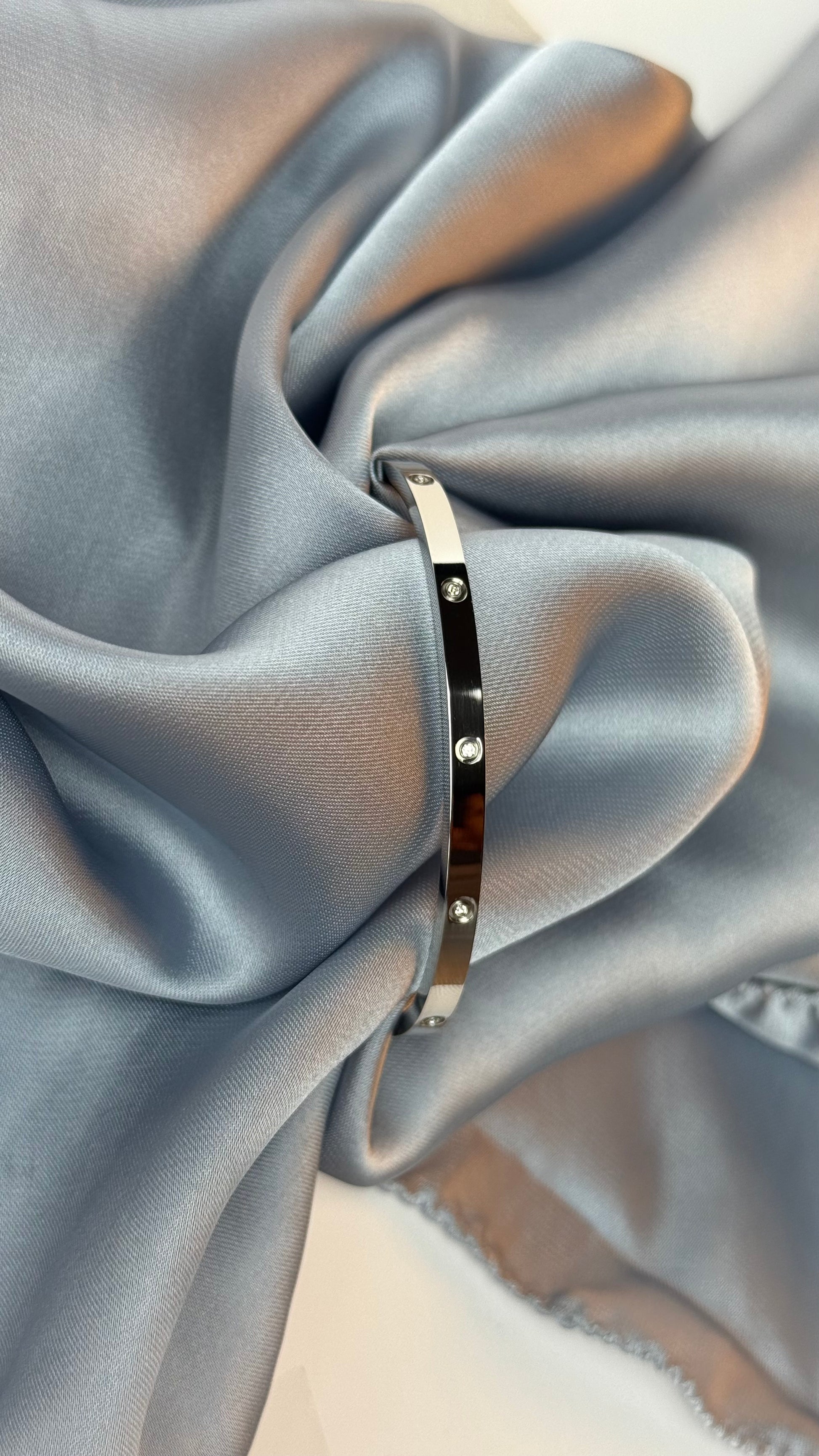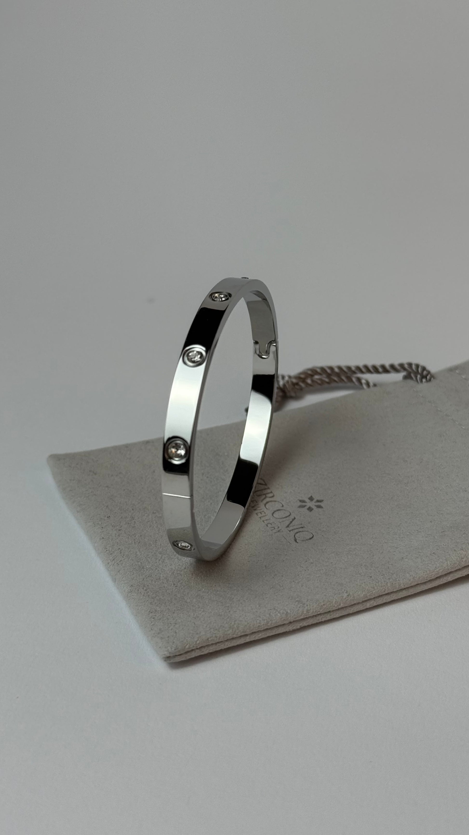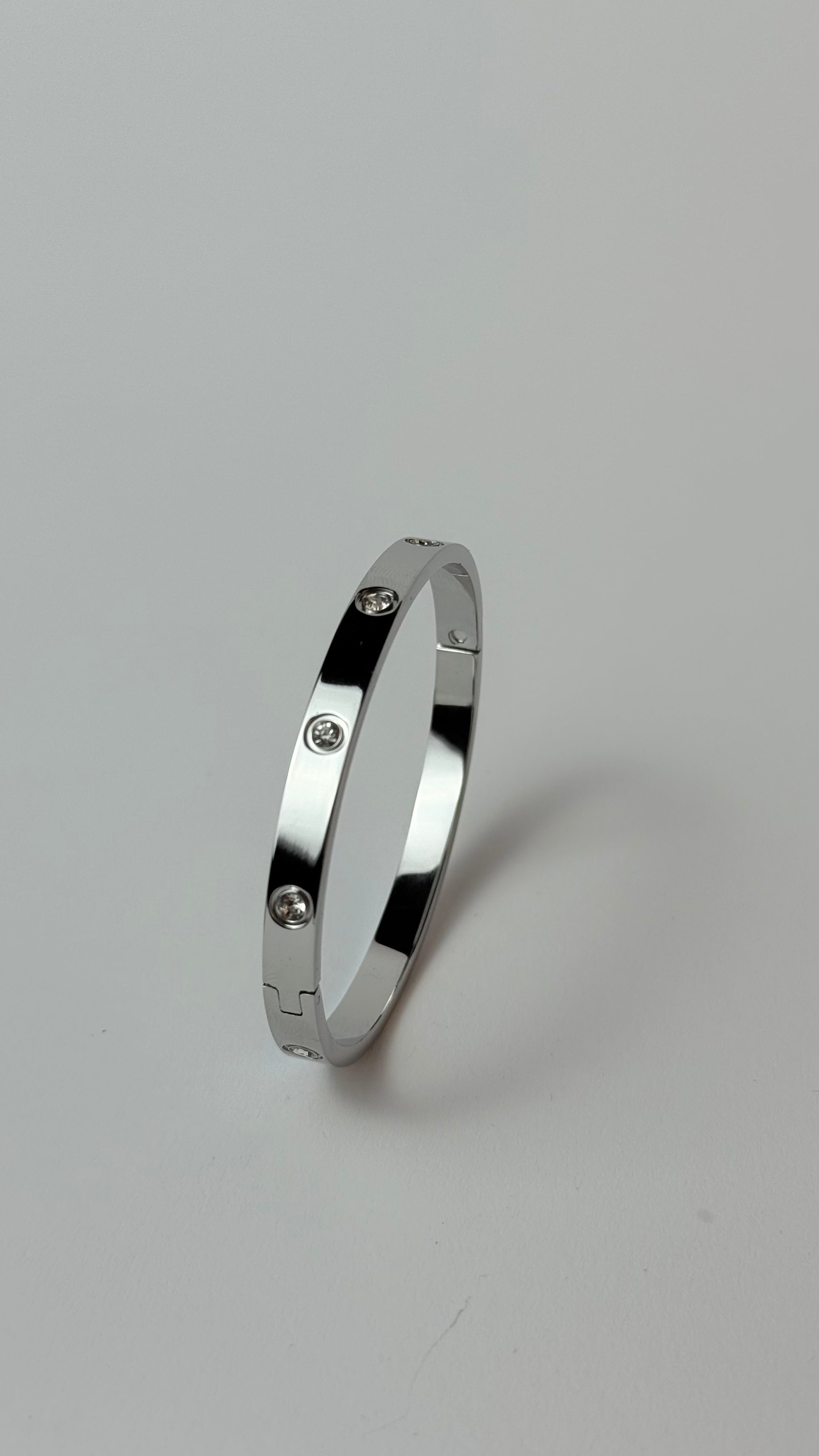 Zircon Studded Stainless Steel Silver Plated Bangle Bracelet - Silver